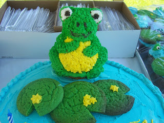 I decided to make my very first birthday cake for Ethan...I bought cakes for his last two birthdays and lots of people had complaints about the taste. So I decided I would finally make one this year and I always wanted to be the kind of mother that made really cute birthday cake's for her kids. I just didn't think I'd be able to do it.... But I went ahead and tried and to my amazement it turned out better then even I thought it would! So this year was Ethan's very first homemade birthday cake and everyone loved it. I was so happy about that! I decided to go with a frog theme and I made cupcakes with sugar cookies as the Lilly pads and froggie eyes popping up out of the water. Anyway it was fun to make and I'm glad that Ethan loved it and everyone loved the taste!